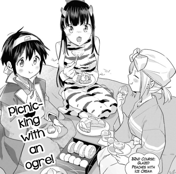 Anyways, here’s another chapter of foodgirls. Shinoda’s family went on a peach-picking trip, so she’s dropped by with a bunch of peaches, asking Ayari to teach her different ways of eating them. Peach soup, peach salad, peach i-oops, better not ruin the surprise! I’ll let you read it and find out for yourself.